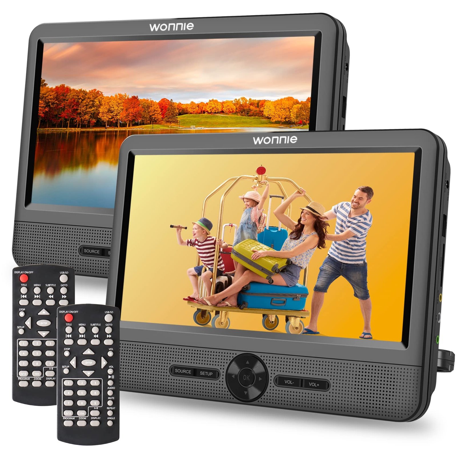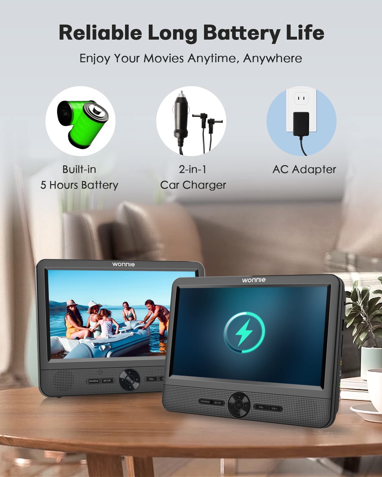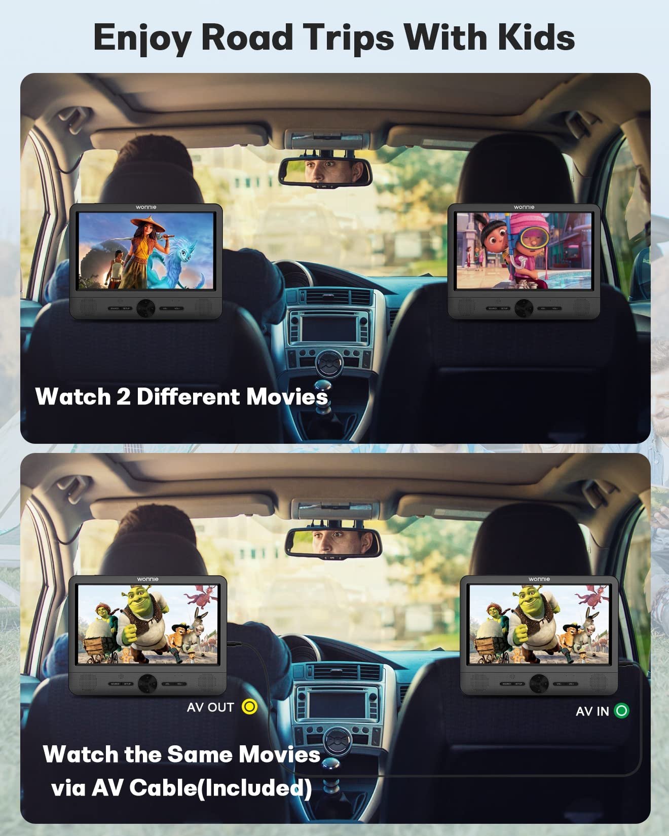 【𝟐 𝐱 𝐂𝐚𝐫 𝐃𝐕𝐃 𝐏𝐥𝐚𝐲𝐞𝐫】WONNIE New generation 10 inches dual dvd players for car adopt newly chip technology, no skipping discs during bumpy rides or any other problems. The portable dvd player for car can play different movies separately and also can play the same movie through an AV cable connection