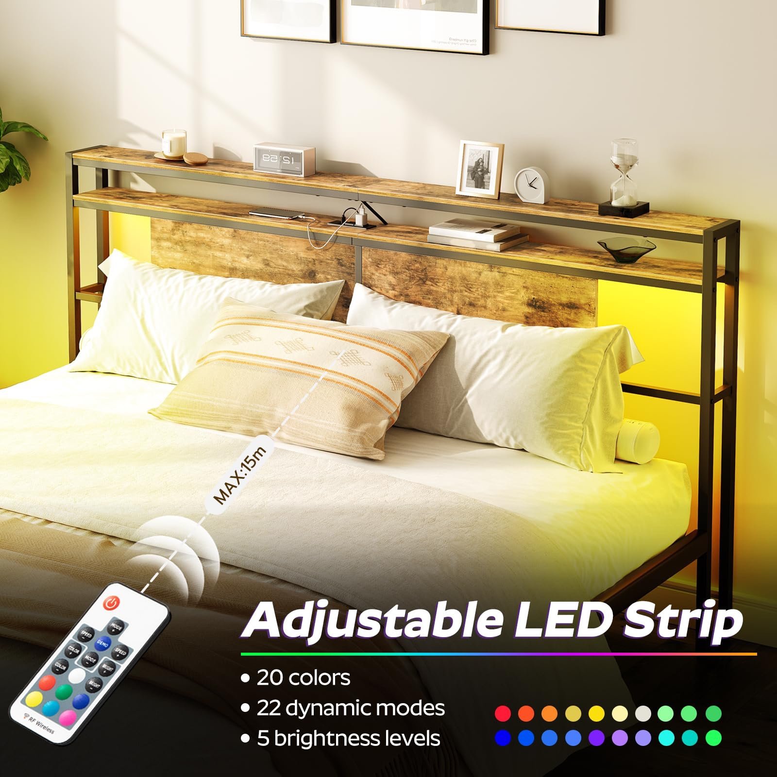 Adjustable LED Strip: Adjust the LED strip on this headboard to create the perfect ambiance for your relaxation. With different brightness and color options, the LED strip can serve as a bedside lamp or reading light to facilitate your rest time