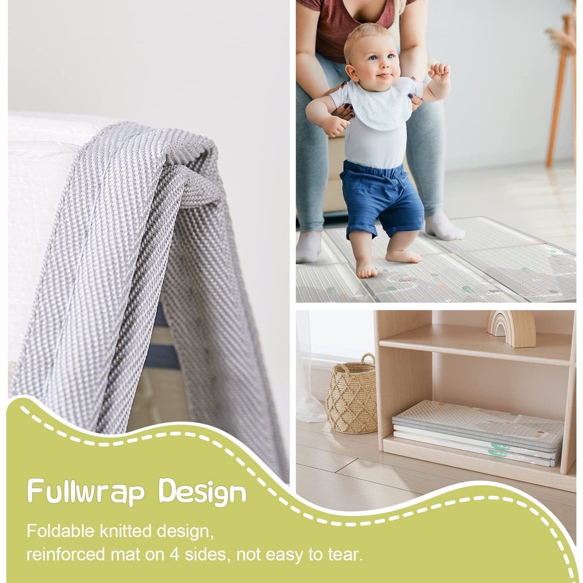 Waterproof Crawling Mat: The playpen has a matching playmat, works well as a crawl / learn to walk mat, and thick to absorb any falls. The corners and edges are reinforced and sewn, making this one a bit more durable than the ones without the sewn edges