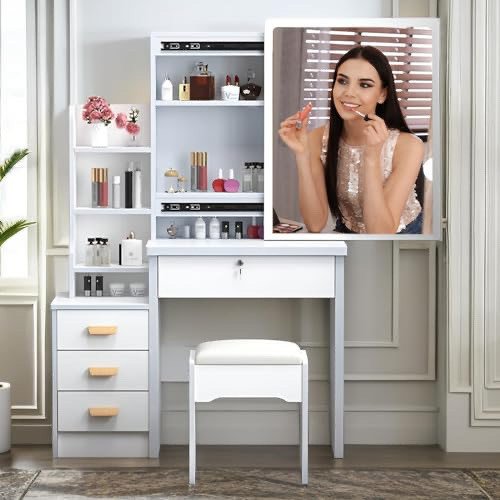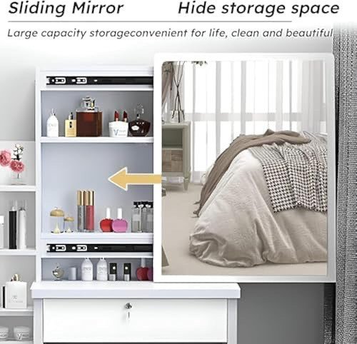 Innovative Sliding Mirror: Elevate your makeup application with our vanity desk’s sliding mirror. The full-size, 23.6″ * 18.9″, borderless mirror slides smoothly on tracks, providing an unobstructed, expansive view for intricate makeup looks, hair styling, or skincare routines. Ideal for everyday use or special occasions, this 4-sided, borderless design meets diverse beauty needs with unparalleled clarity.