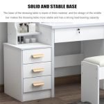 DescriptionSpacious and Elegant Design: Transform your beauty routine with our expansive makeup vanity desk, featuring a sleek white finish. Equipped with a broad tabletop and four generously sized drawers, this vanity ensures your cosmetics, jewelry, and beauty essentials are neatly organized and accessible. Its elegant design enhances your bedroom’s aesthetics, offering a clutter-free and stylish space.